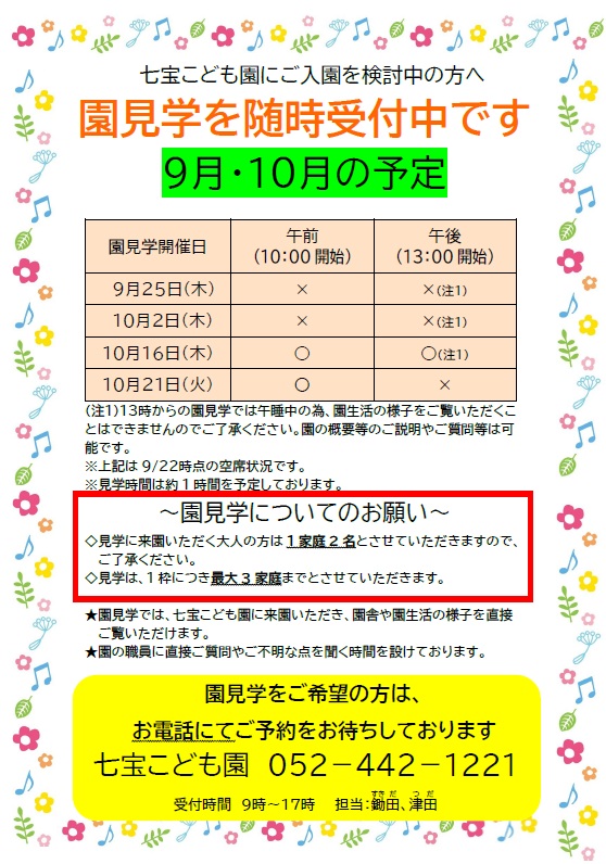 七宝こども園 (052)-442-1221 (平日9:00~17:00 担当:鋤田・津田)