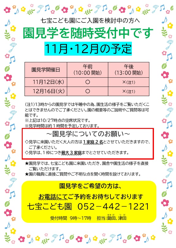 七宝こども園 (052)-442-1221 (平日9:00~17:00 担当:鋤田・津田)