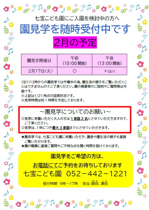 七宝こども園 (052)-442-1221 (平日9:00~17:00 担当:鋤田・津田)